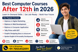 In today’s time, computers are used in almost every field. From small shops to big companies, most work depends on digital tools. Businesses promote themselves online, accounts are managed using software, and even basic office work requires computer knowledge. From small businesses to large companies, all work depends on computers. Marketing is now digital, accounting is done using software like Tally, and even basic office work requires computer knowledge. That’s why students today are focusing on best computer courses for job, best computer courses for high salary, and even best computer courses near me.